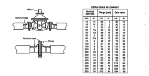 The extra heat trace cable allowance required for flanges valves and pipe shoes, See below table for more information: