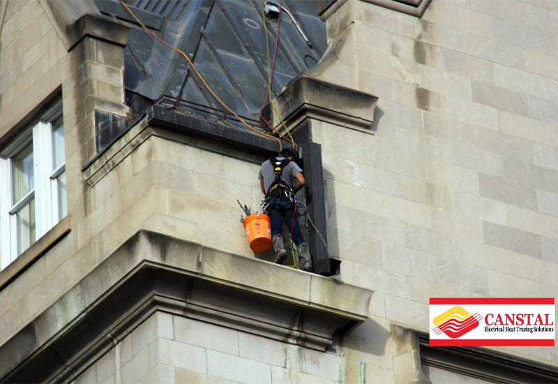 Downspout Heat Trace Hotel Roof Heat Trace Rope Access Downspout self Regulating Heat Trace Snow Melting Toronto