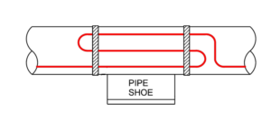 It is very common to see pipe supports and pipe shoes connected to an industrial and commercial pipes, for any heat trace application wither its maintain temperature or a freeze protection an extra heat trace cable allowance must be added to the pipe near the pipe support and pipe shoe to compensate for the heat loss, this will apply for any type of the heat trace cables wither its Self regulating heat trace cable or MI heat trace cable. see the picture below from a recent project we supplied and install in Toronto area.