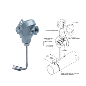 The RTD-100 is designed for use as control input for freeze protection and temperature maintenance applications requiring pipewall or tankwall temperature sensing. A cast-aluminum NEMA 4X/7 enclosure and terminal block allows ease of wiring into a single unit that can be installed directly onto a heat traced pipe. The RTD-100 housing and mounting pad are stainless steel. The RTD-100 is suitable for use in heat tracing applications where surface temperatures do not exceed 900°F (482°C)